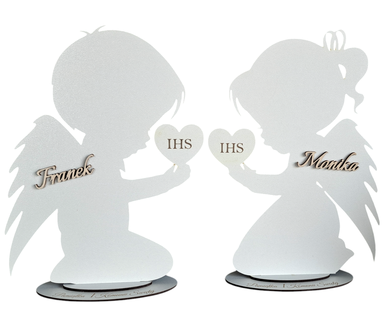 Aniołek z imieniem i serduszkiem Pierwsza Komunia Święta figurka do kościoła
