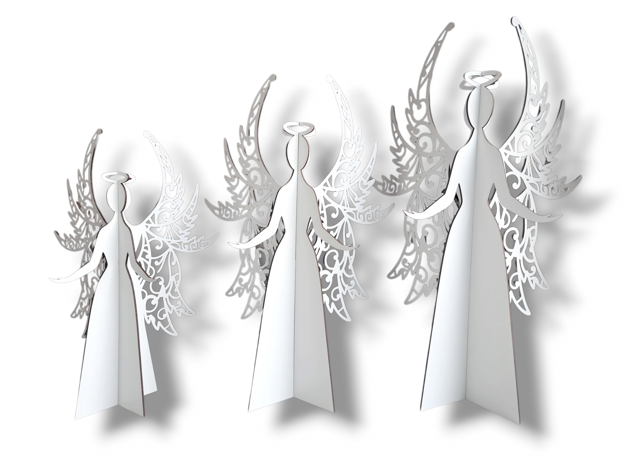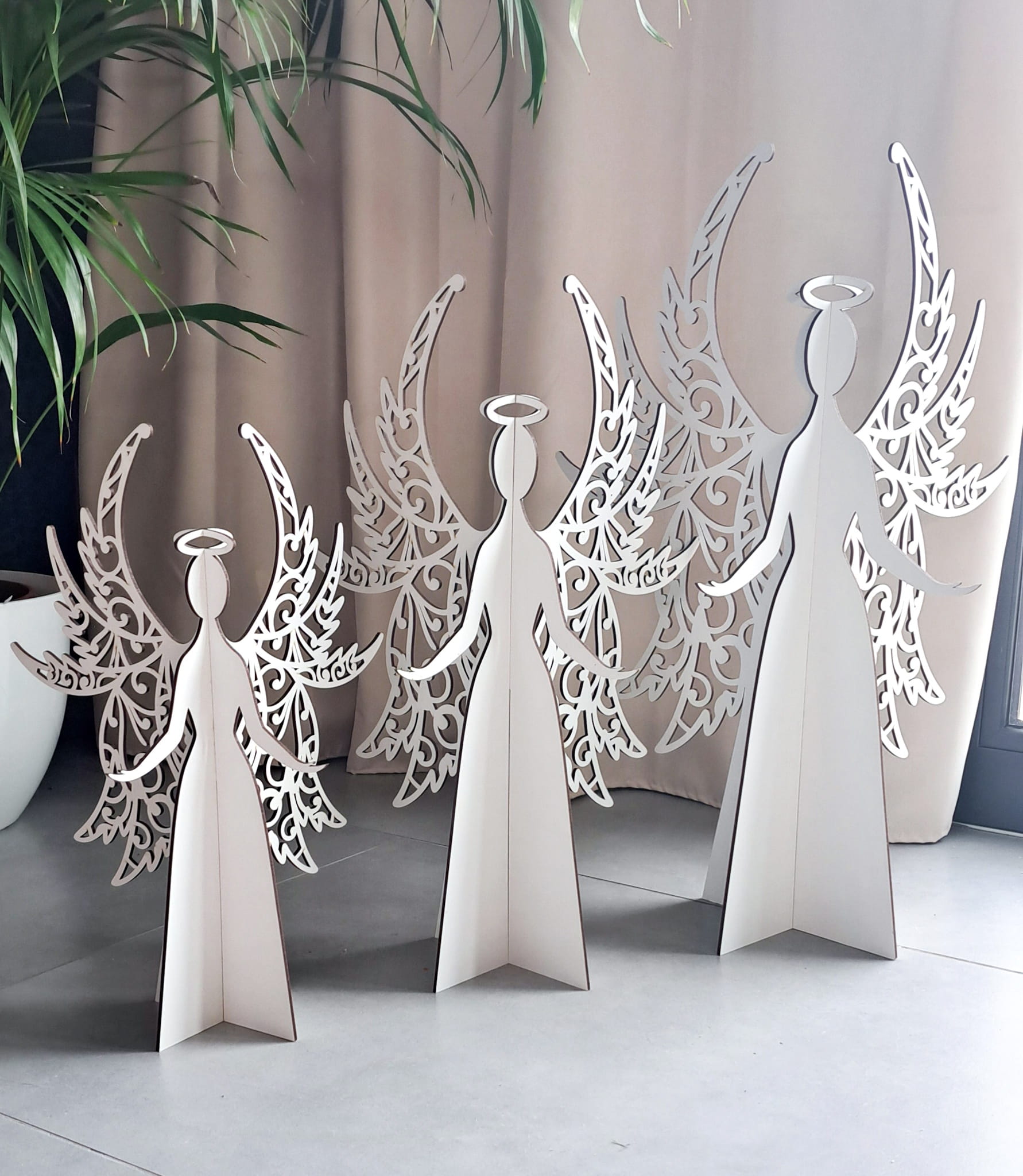 W zestawie otrzymasz: 6 elementów = 3 aniołki o wysokości: 60cm, 50cm, 40cm