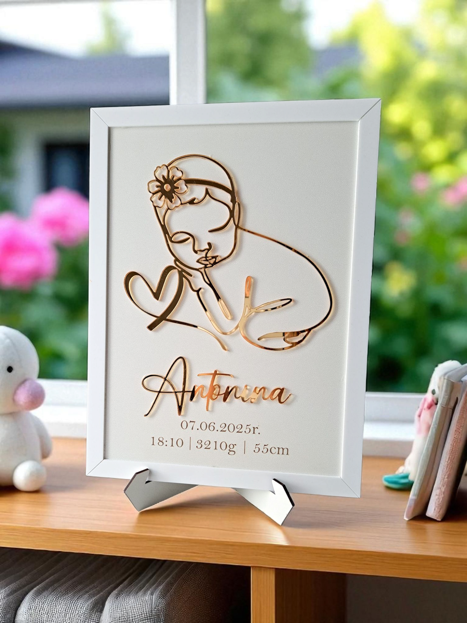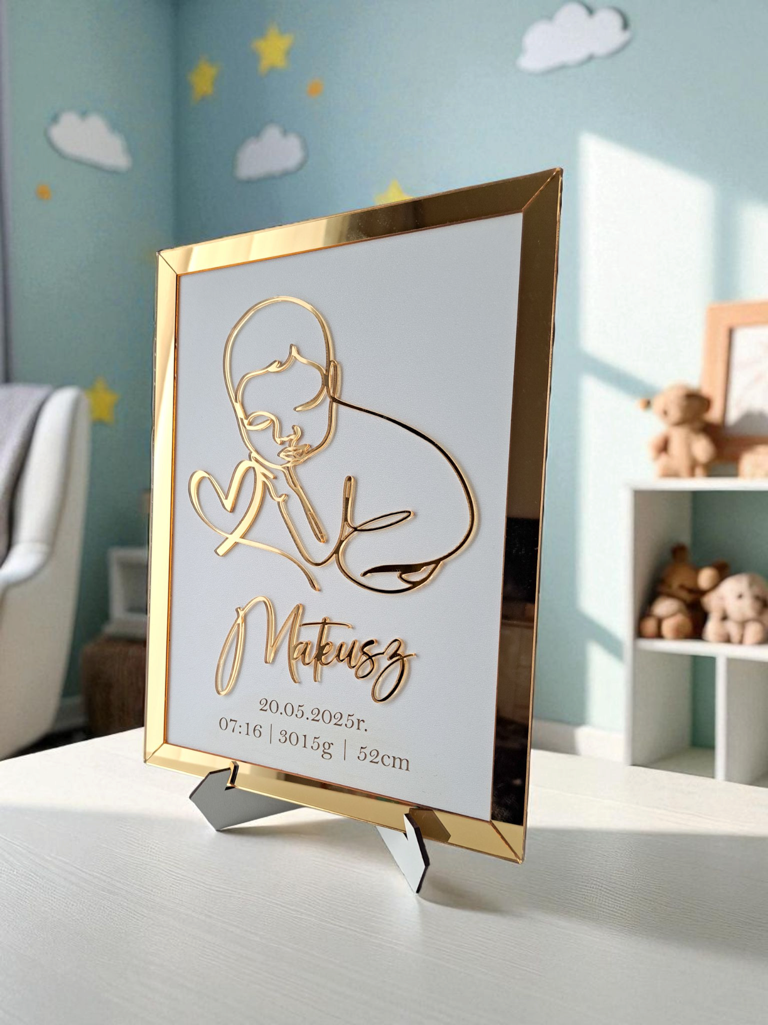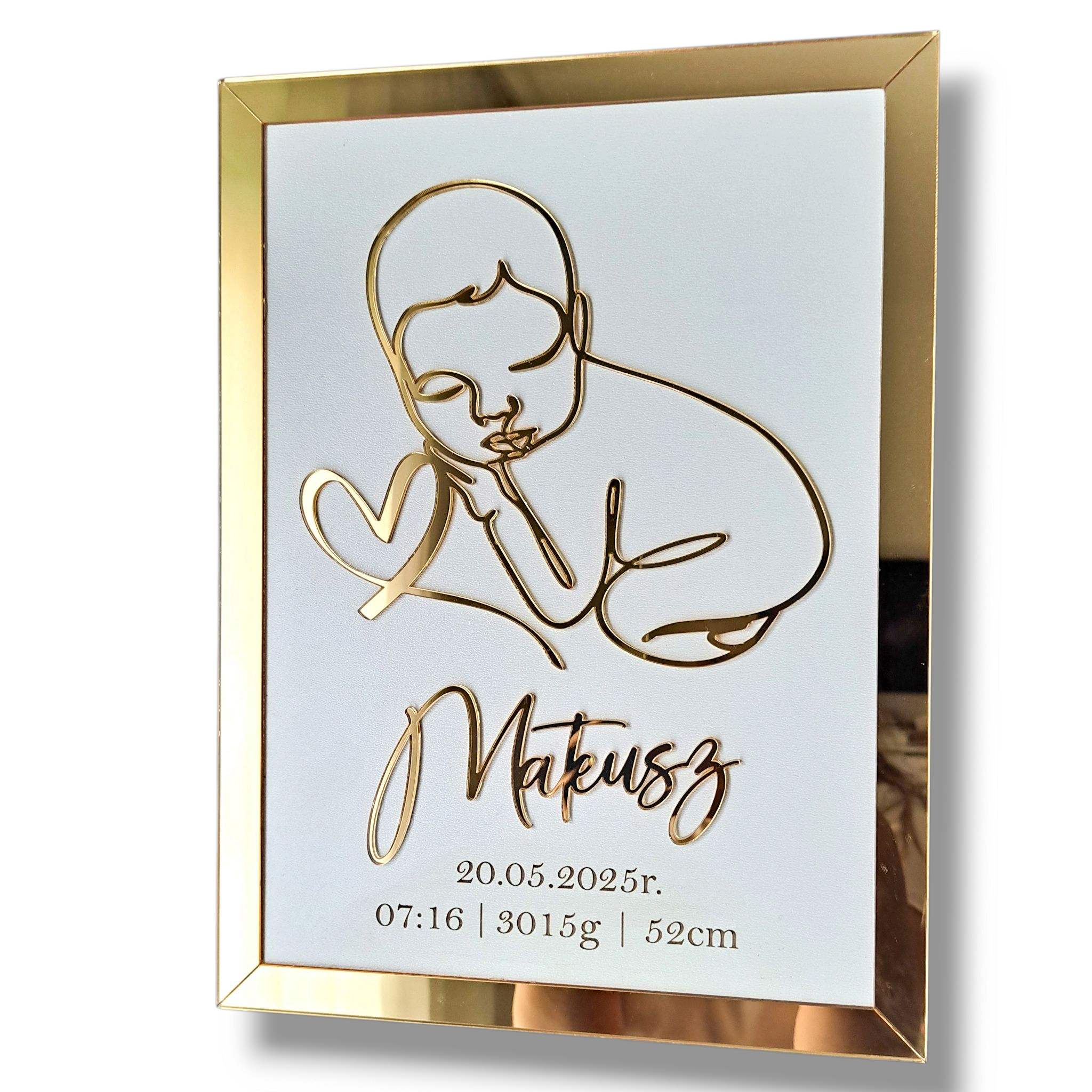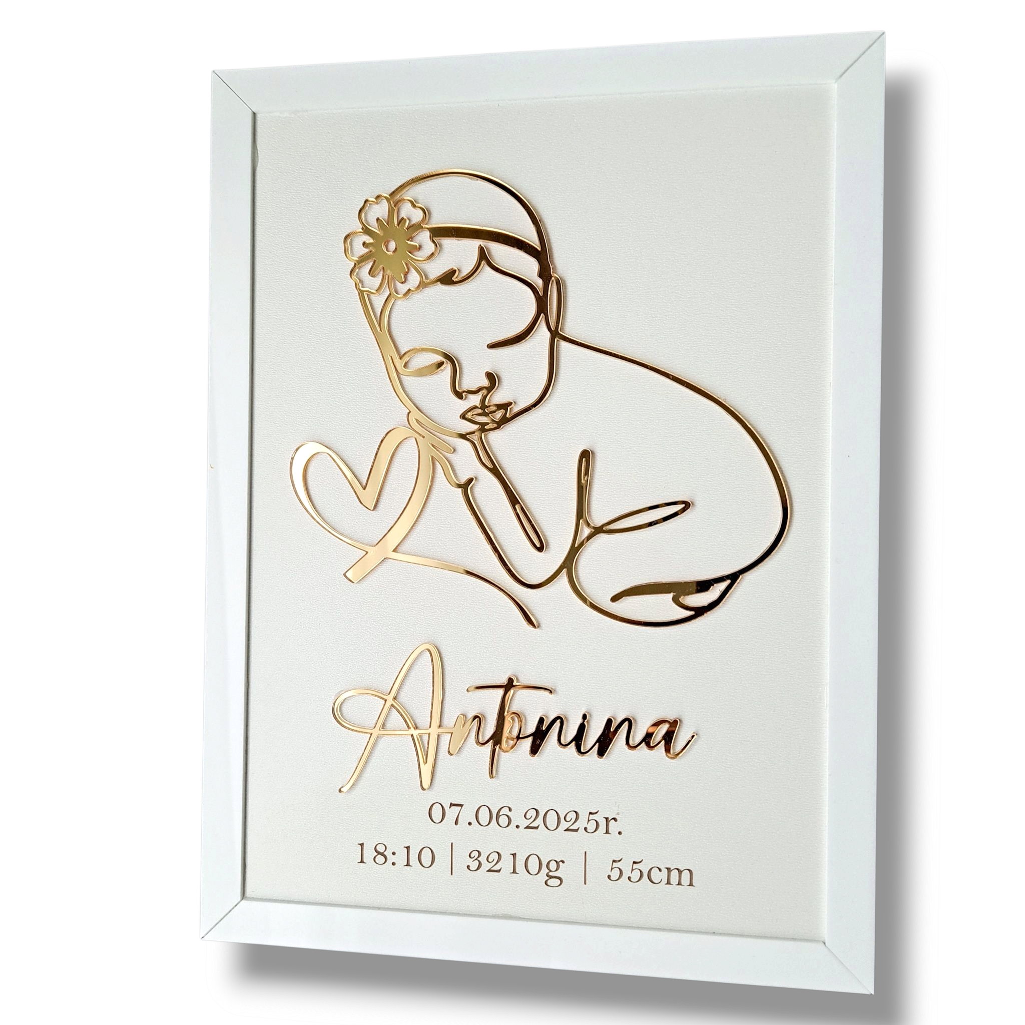 Szukasz wyjątkowego prezentu z okazji narodzin dziecka, chrztu lub baby shower? Nasza personalizowana metryka w eleganckiej biało-złotej oprawie to pamiątka na całe życie, która pięknie ozdobi pokój maluszka i wzruszy każdego rodzica!