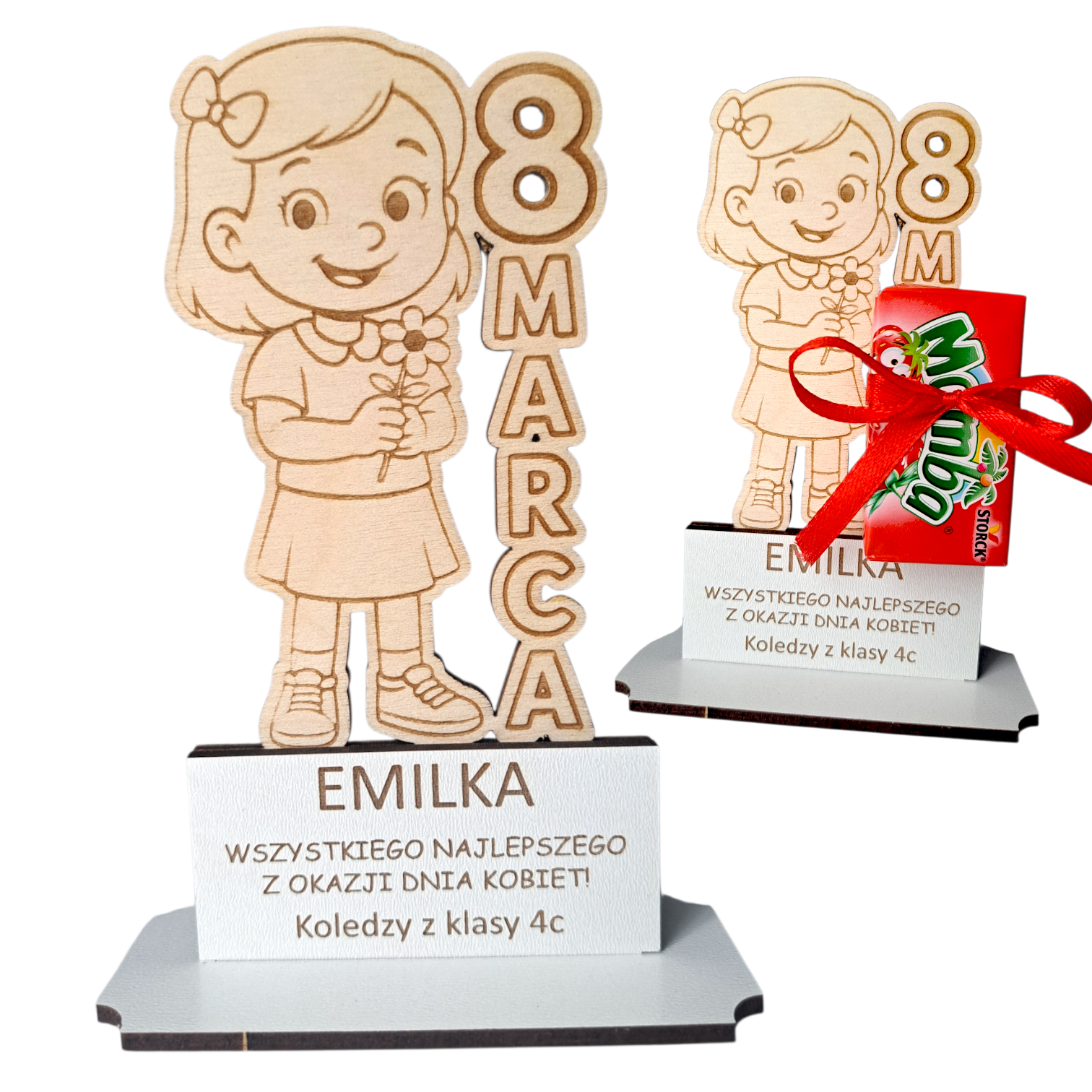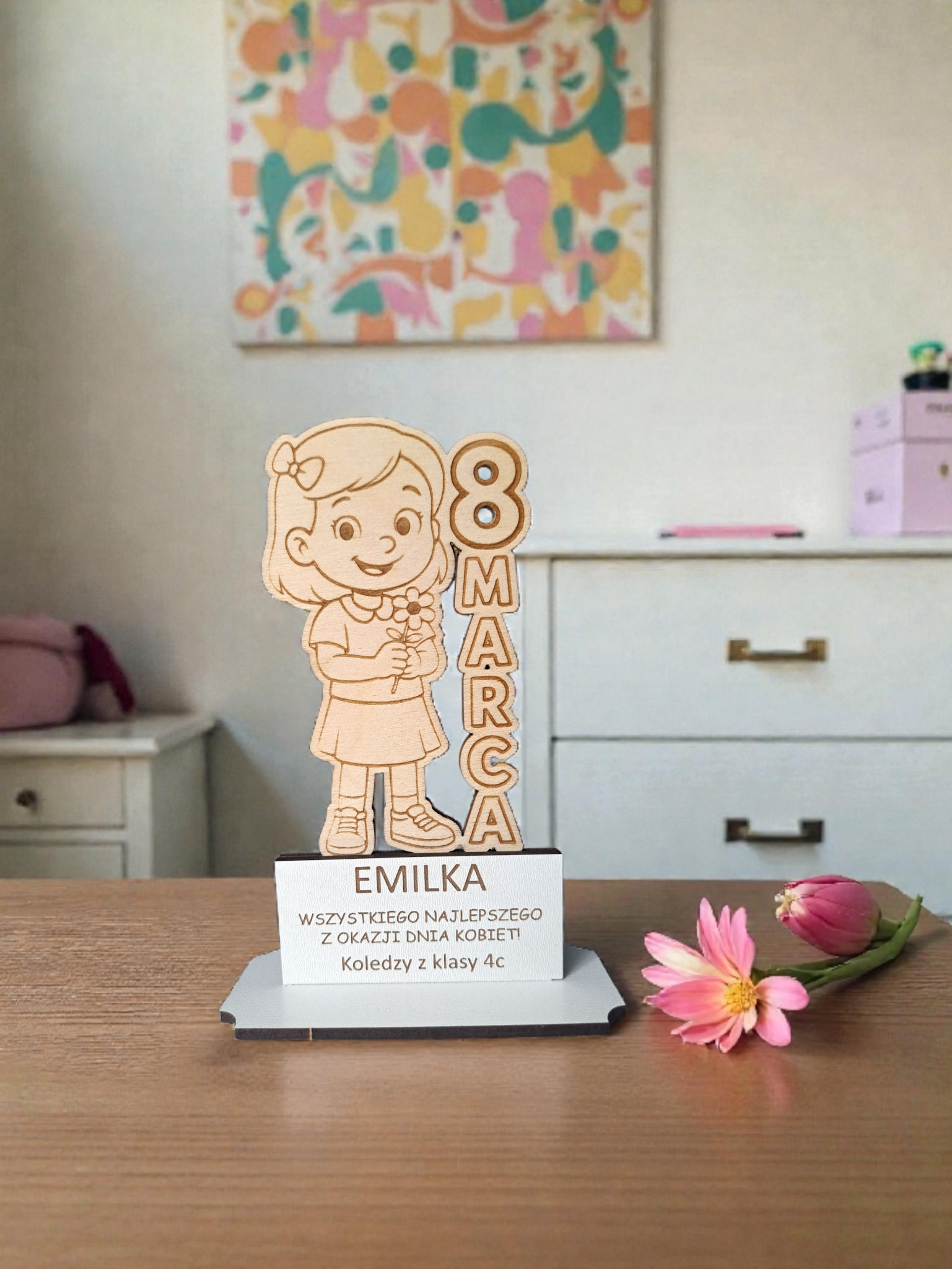 To idealny drewniany prezent na Dzień Kobiet dla dziewczynek, uczennic, koleżanek z klasy. Dzięki możliwości dodania imienia oraz krótkich życzeń statuetka staje się unikalną pamiątką.
