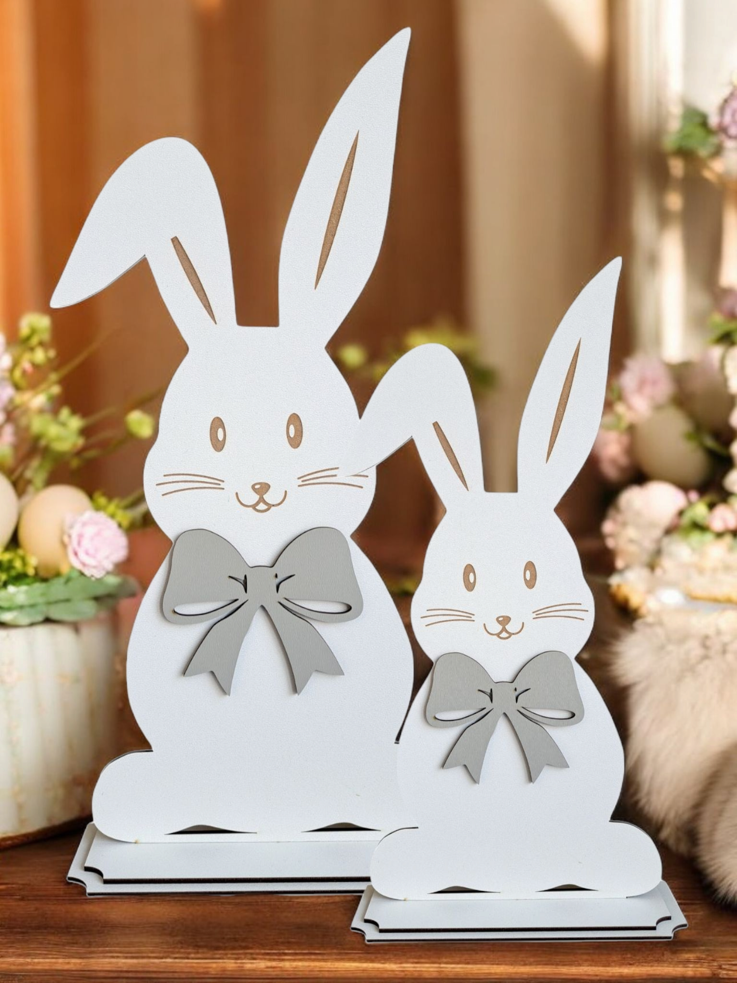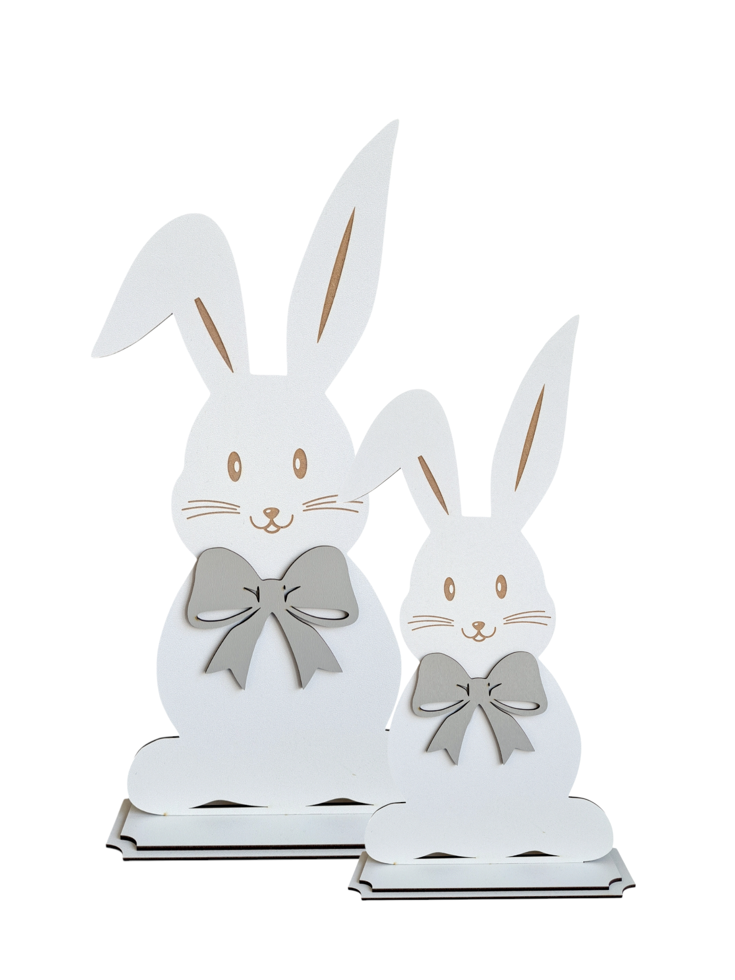 Wzbogać swoje wnętrze o uroczy komplet dwóch drewnianych zajączków, idealnych na Wielkanoc! Wykonane z wysokiej jakości płyty HDF, w kolorze białym, z szarą kokardką, zajączki wprowadzą do Twojego domu wiosenny, świąteczny nastrój. Białe podstawki gwarantują stabilność i elegancki wygląd.
