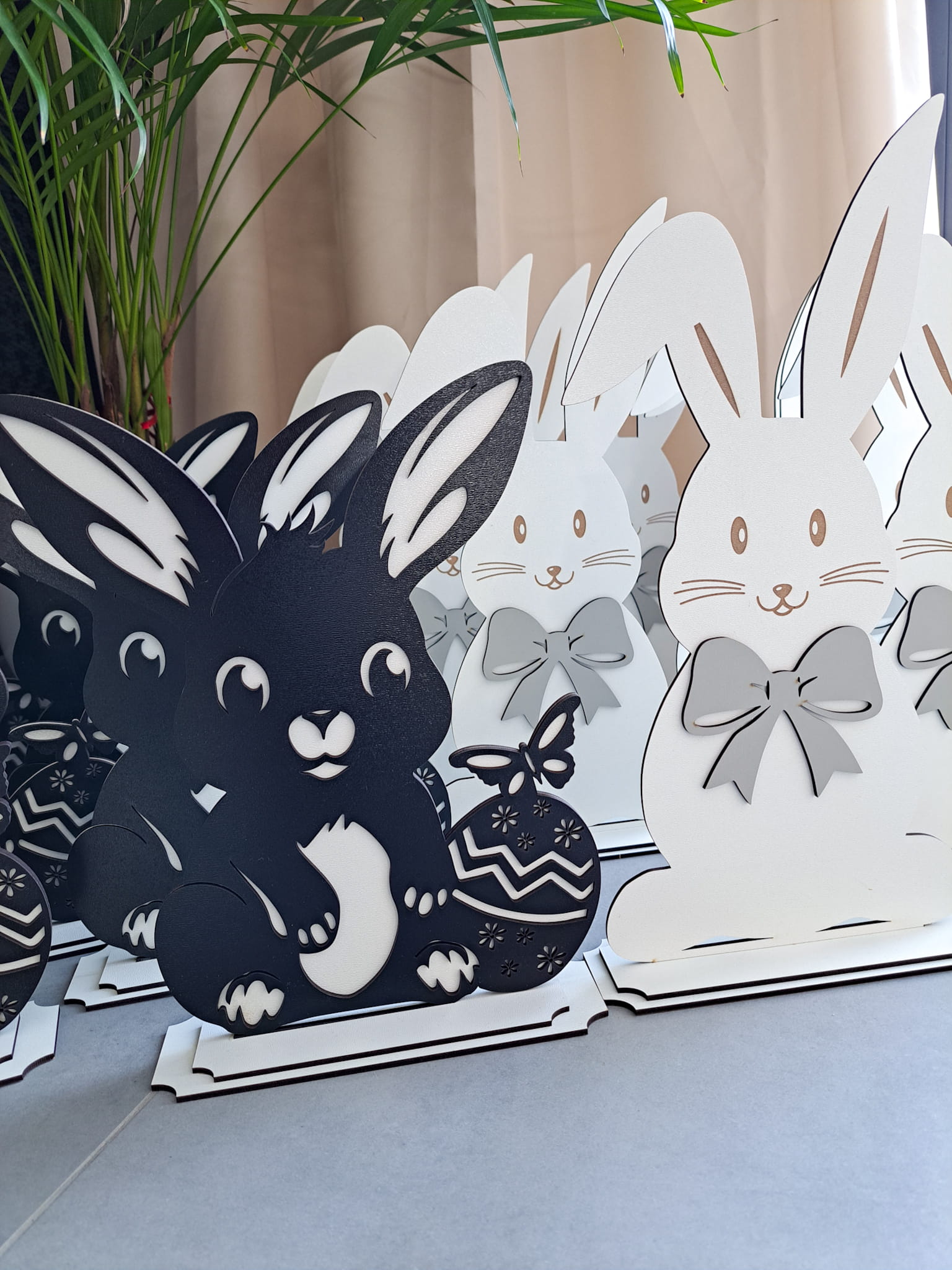 Komplet zajączków jest bardzo prosty w montażu – wystarczy włożyć figurki do podstaw i gotowe! To dekoracja, która doskonale sprawdzi się na stole, półce czy komodzie, dodając wnętrzu uroku i świątecznego klimatu.